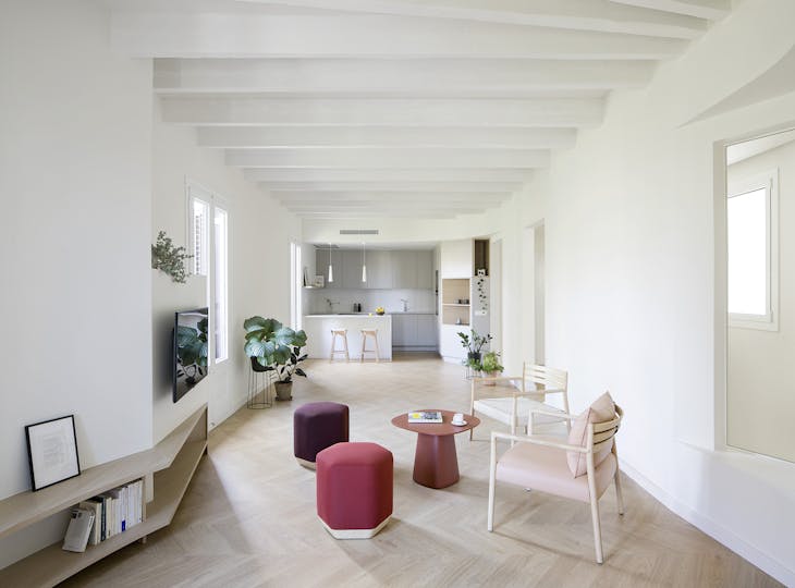Un mueble bajo sigue la curva existente, destacando la distintiva esquina que define las viviendas de las esquinas del Eixample. La pieza de mobiliario abraza la ventana y genera un rincón íntimo que invita al juego y a la lectura.